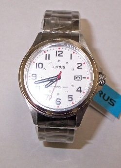 Back Gents Lorus white quartz watch with round dial; date; numbers date stainless steel bracelet. wr10 MSRP: $85 SKU: WAT3584 Share on Twitter Share on PinterestShare on FacebookShare: Reserve in Store name email phone Preferred Method of Contact email phone Reserve